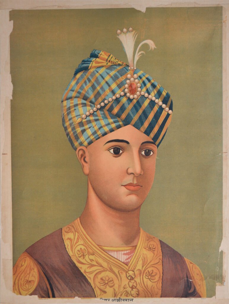 Hyder Ali Khan (c. 1720-1782) at time of Anglo-Mysore War Size: 19.8 x 14.6 in (50.3 x 37.1 cm) Date of printing: 1880s-1890s The most famous portrait of Hyder Ali printed by Chitrashala Press is based on a steel engraving by a British artist from 1780. During the second Anglo-Mysore War, the British captured the […]