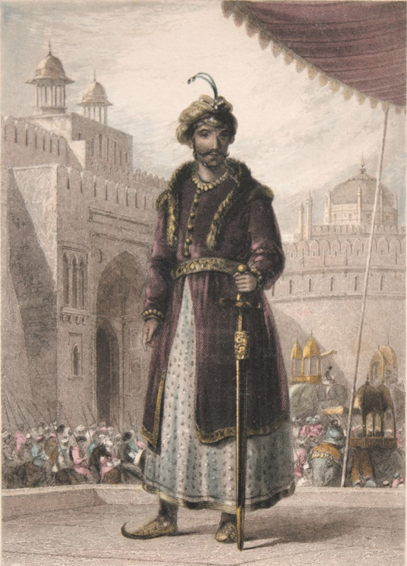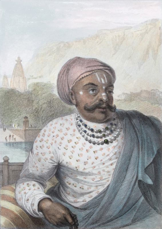 Mahadji Scindia (1730 – 1794) Maratha ruler of Gwalior state. He expanded his empire winning many wars between 1745 and 1761, roughly around 50 wars. He suffered a serious wound in his leg, which left him with a limp for the rest of his life. Steel engraving by W. D. Taylor (1794 – 1857), after […]