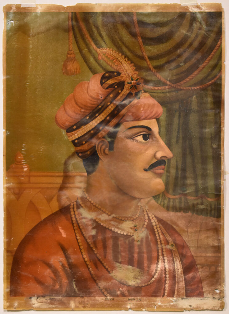 Hyder Ali Khan (c. 1720-1782) at time of Anglo-Mysore War Size: 19.8 x 14.6 in (50.3 x 37.1 cm) Date of printing: 1880s-1890s The most famous portrait of Hyder Ali printed by Chitrashala Press is based on a steel engraving by a British artist from 1780. During the second Anglo-Mysore War, the British captured the […]