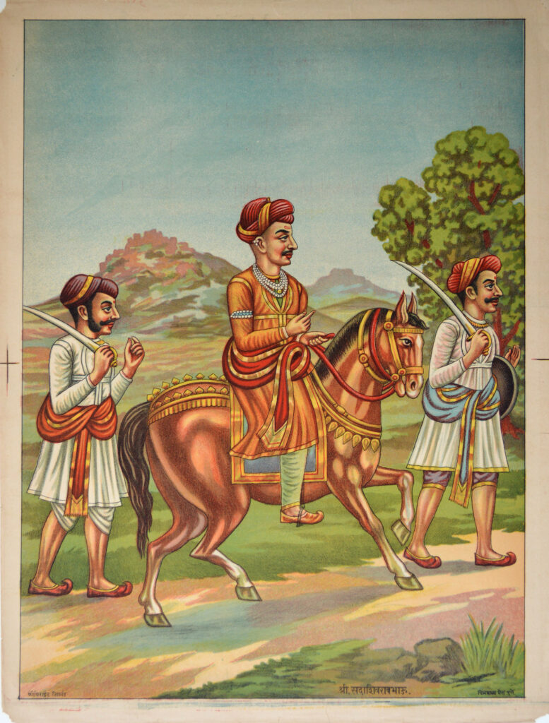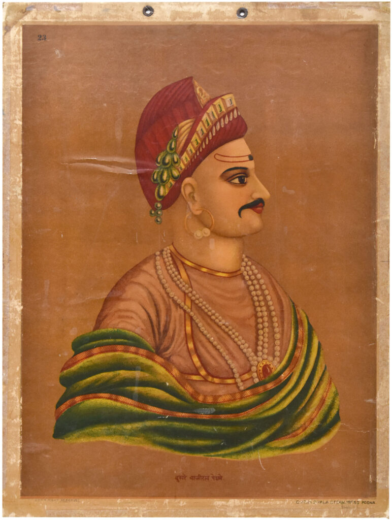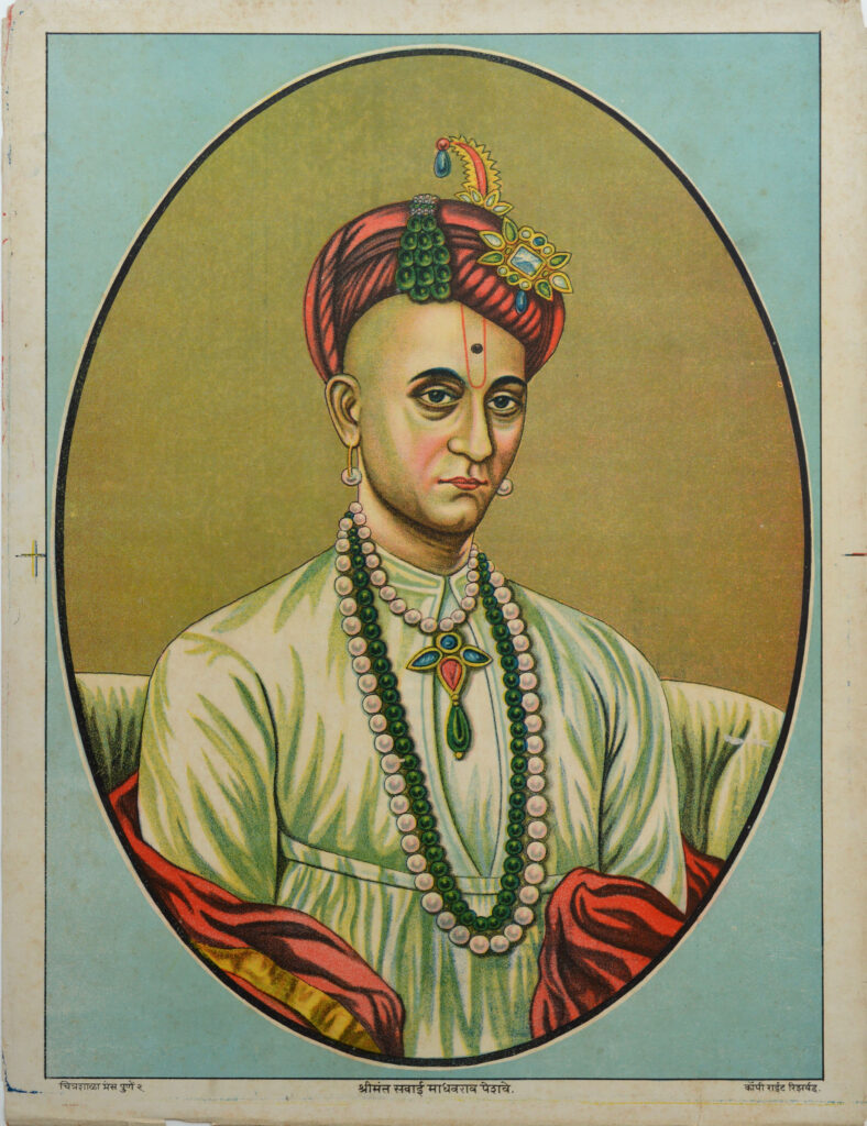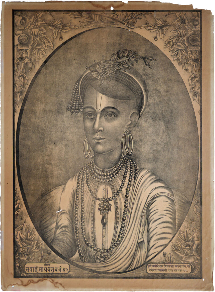 Shrimant Sawai Madhavrao (1774-1795) Size: 21.5 x 15.7 in (54.6 x 39.9 cm) Date of printing: late 1870 Before the formal inception of a dedicated press for imagery, Pune Manovedhak Chitrakala Company Press was established in Ravivar Peth, Pune. The press published manuscripts but also did a first series of portraits (above pic). The imagery […]
