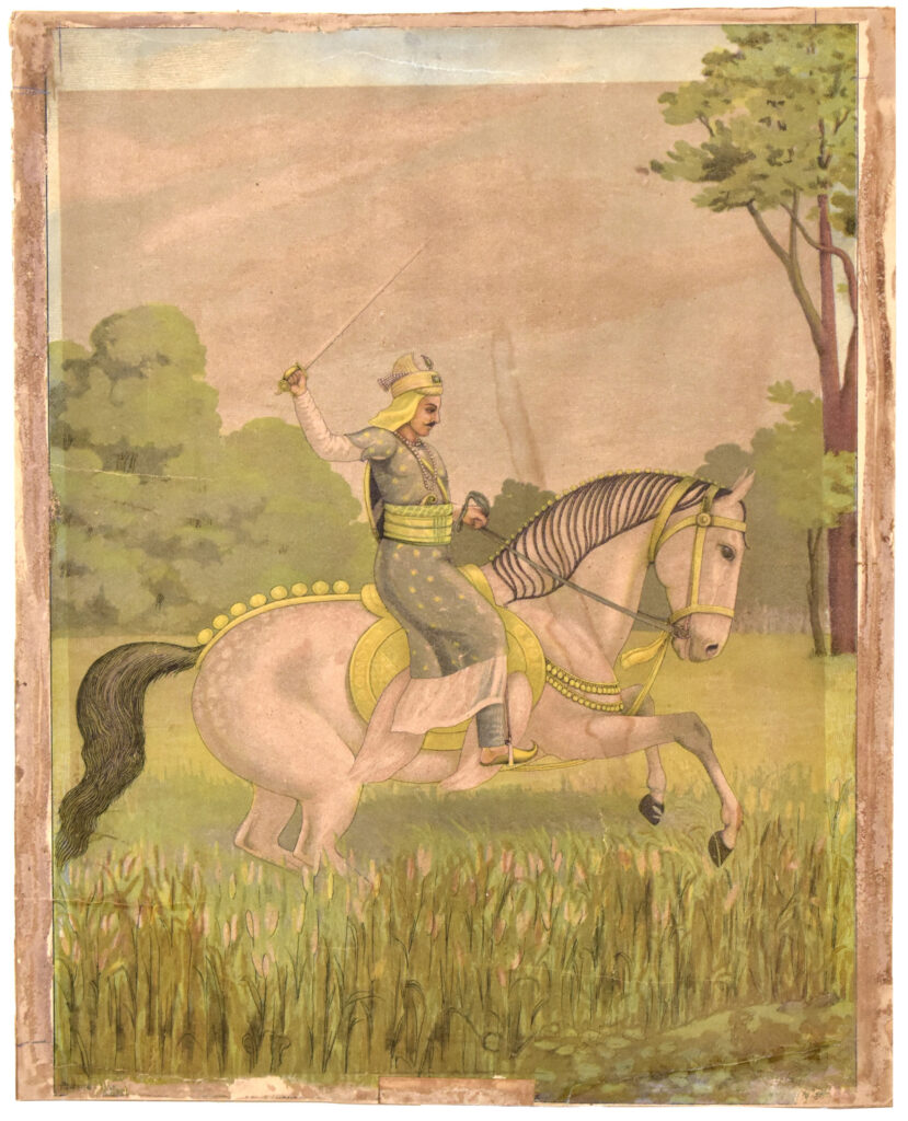 Baji Prabhu Deshpande (c. 1615-1660) Size: 19.5 x 14.4 in (49.5 x 36.6 cm) Date of printing: 1880s-1890s Baji Prabhu Deshpande was one of Shivaji’s officer. His legend is linked with an important rear-guard battle which enabled Shivaji to escape from the Panhala fort. This hero sacrificed his life for the Father of the Maratha […]