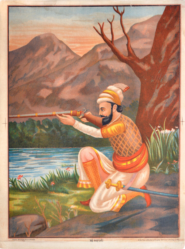 Sambhaji (1657-1689) Size: 19.5 x 14.4 in (49.5 x 36.6 cm) Date of printing: 1880s-1890s After Shivaji’s death, his eldest son, Sambhaji Bhonsle, was his successor as Chhatrapati (Emperor) of the Maratha Empire. He ruled the empire for nine years, leading wars against the Mughal Empire as well as other neighbouring powers such as the […]