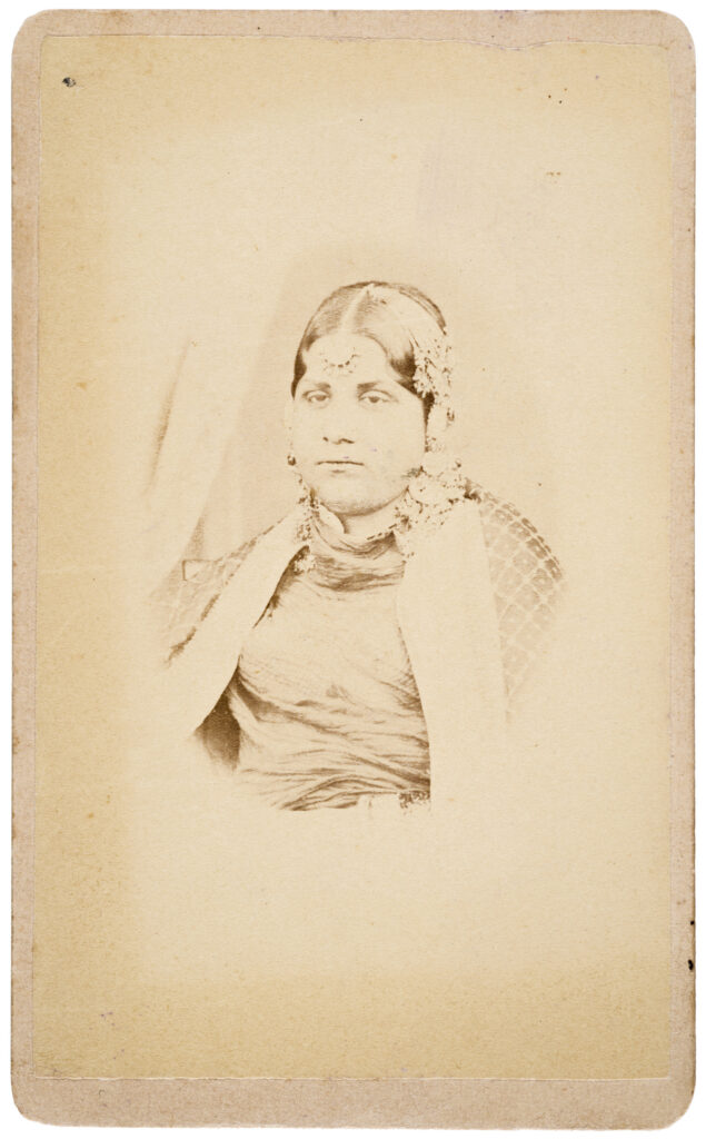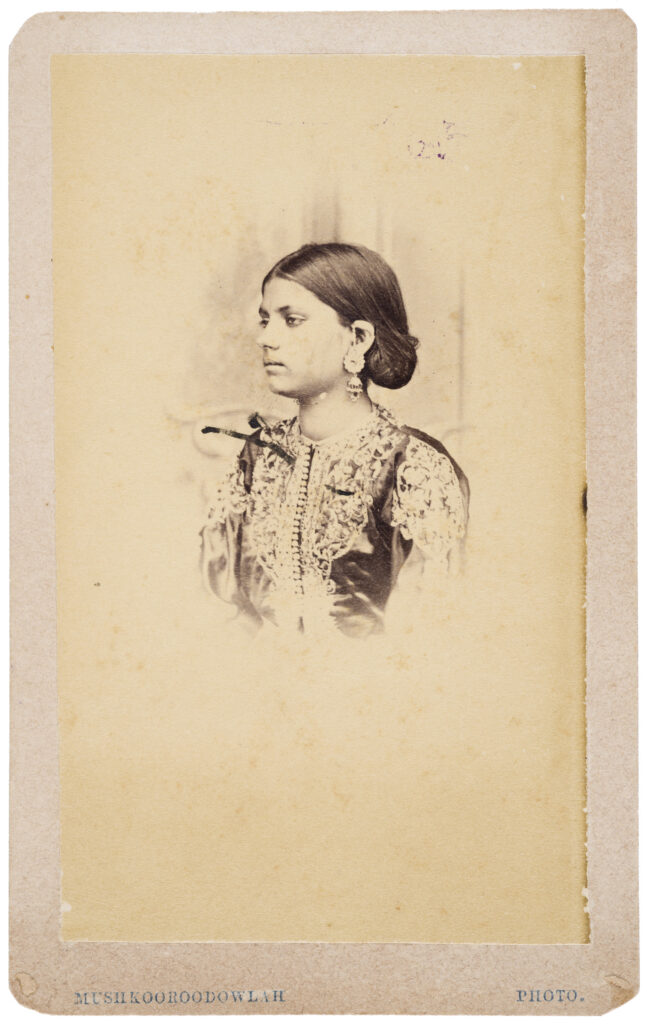 Mankiya Albumen print on carte-de-visite, c. 1870 Size: 4.2 x 2.4 in (10.6 x 6.2 cm) Photographer: Mushkooroodowalah Studio, Lucknow Inscription: Manki (Urdu) Mankiya (Hindi)