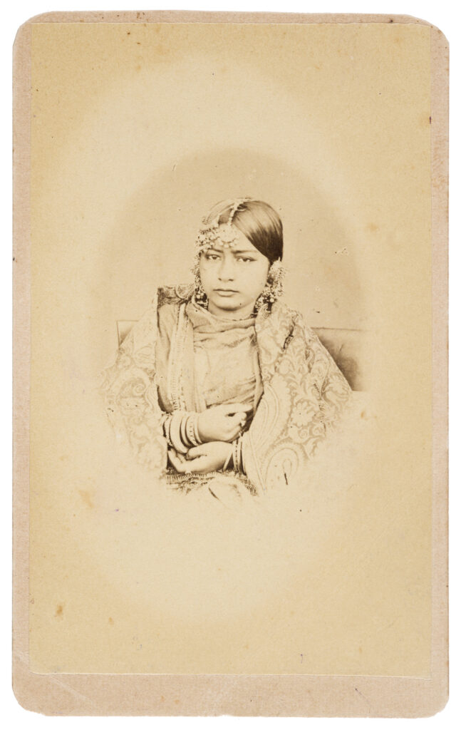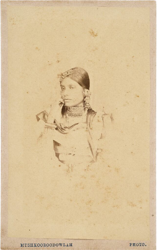 Kamla Albumen print on carte-de-visite, c. 1870 Size: 4.1 x 2.5 in (10.5 x 6.4 cm) Photographer: Mushkooroodowalah Studio, Lucknow Inscription: Kamla (Urdu & Hindi