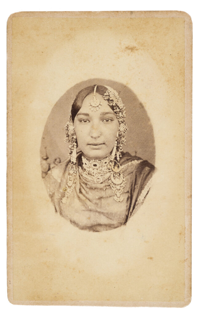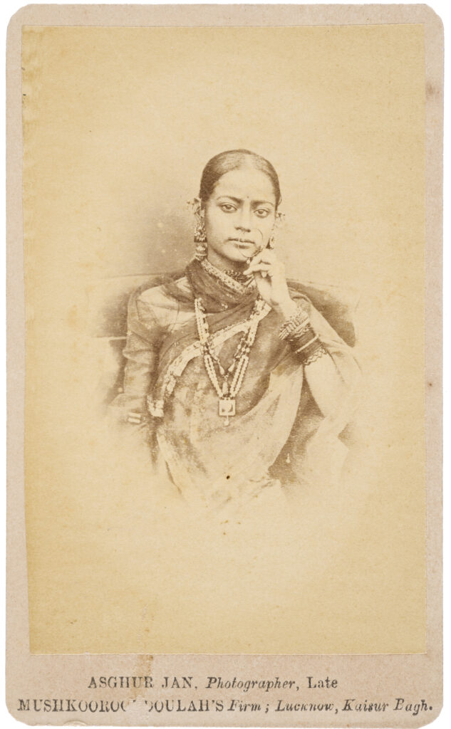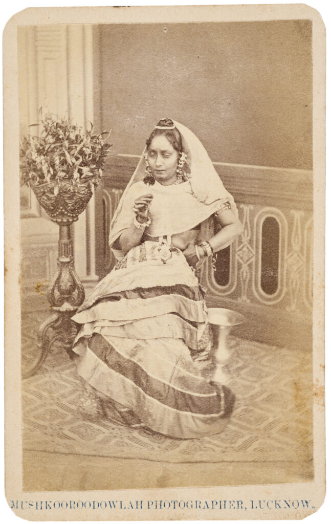 Gohar Jaan Albumen print on carte-de-visite, c. 1860 Size: 4 x 2.5 in (10.2 x 6.4 cm) Photographer: Mushkooroodowlah, Lucknow Inscription: Gohar Jaan, Tawaif Umdakhanm wali (Urdu & Hindi)