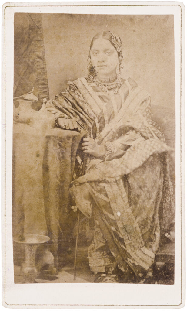 Malka Jaan, Calcutta Albumen print on carte-de-visite, c. 1875 Size: 4.1 x 2.5 in (10.4 x 6.4 cm) Photographer: W. C. Ghosh, Banaras Inscription: Mem Malka, Calcutta ki (Hindi)