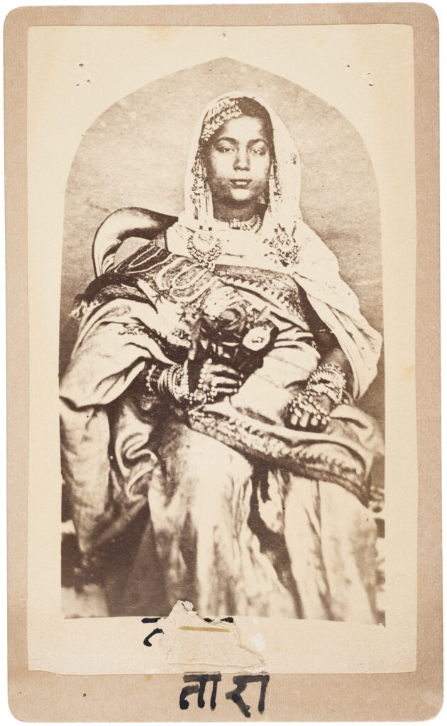 Tara Albumen print on carte-de-visite, c. 1870 Size: 4.1 x 2.5 in (10.4 x 6.4 cm) Photographer: Unknown Inscription: Tara, Banaras ki (Hindi)