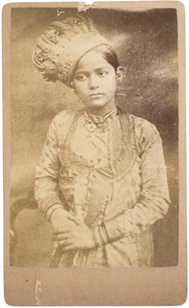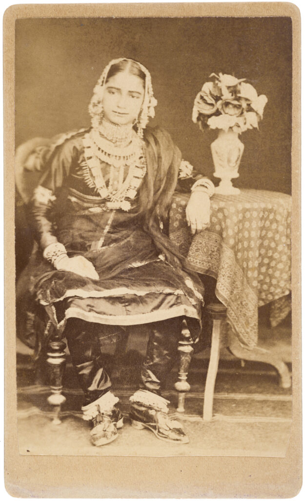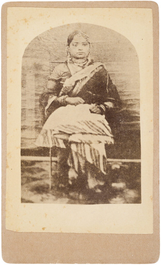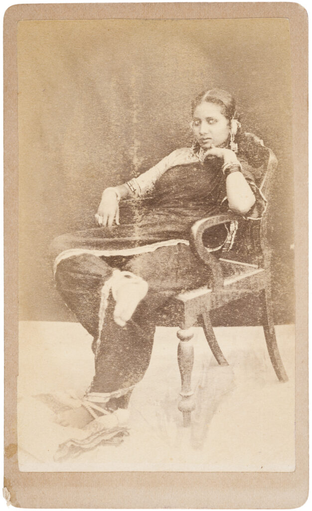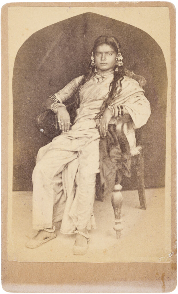 Malka Albumen print on carte-de-visite, c. 1870 Size: 4.1 x 2.5 in (10.4 x 6.4 cm) Photographer: W. C. Ghosh, Banaras Inscription: Malka, Gafurnki badi bahen, Banaras ki (Hindi)