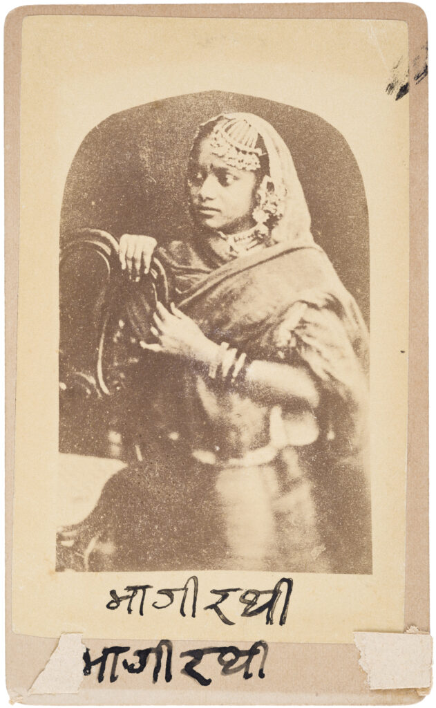 Bhagirathi Albumen print on carte-de-visite, c. 1870 Size: 4.1 x 2.5 in (10.4 x 6.4 cm) Photographer: W. C. Ghosh, Banaras Inscription: Bhagirathi, Banaras ki (Hindi)
