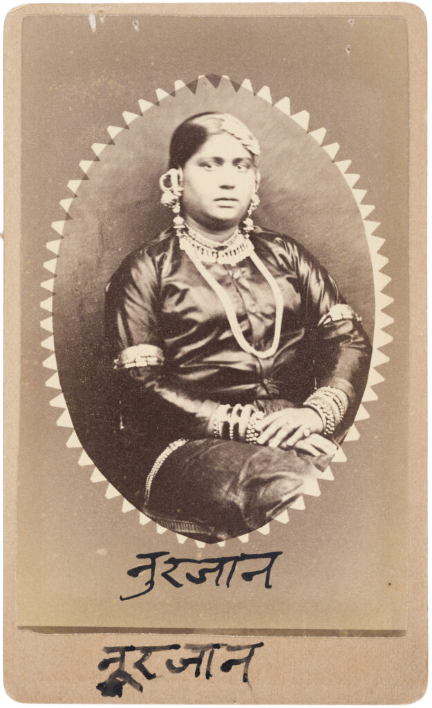 Noor Jaan Albumen print on carte-de-visite, c. 1870 Size: 4.1 x 2.5 in (10.4 x 6.4 cm) Photographer: Unknown Inscription: Noor Jaan, Banaras ki (Hindi)