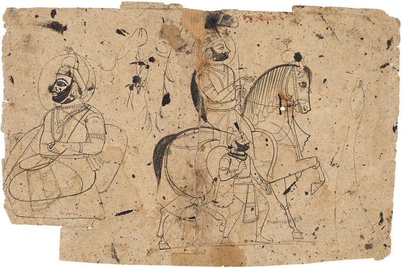 Unidentifiable Mewar noble riding a horse by Mewar court artist circa 1830 CE Khakha or drawing on paper 7 x 10 in. (17.8 x 25.4 cm.) The technique of traditional paintings includes six stages, where after preparing the base artist begins with sketching and composing the frame which is then followed by colour filling, shading, final lining and […]