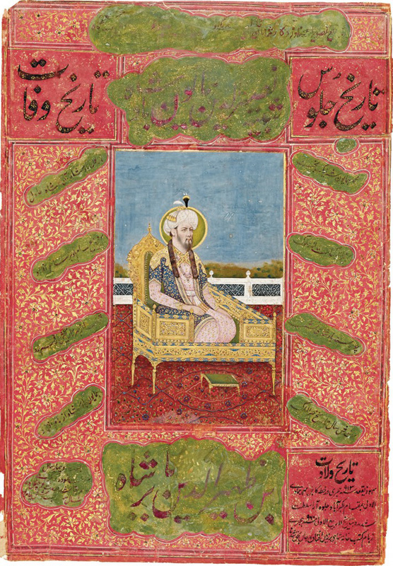 Nasir-ud-din Humayun kneeling on a golden throne
