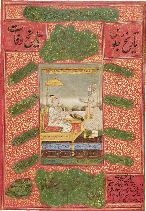 Shahab-ud-din Shah Jahan (1592 – 1666) kneeling on throne by Mughal Delhi artist dated 1853-54 Opaque watercolour and gold on paper Folio: 16.75 x 12 in. (42.5 x 30 cm.) Shah Jahan was the fifth Mughal emperor. He ruled from 1628 until 1658. His birth name was Khurram but his father Jahangir granted him the […]