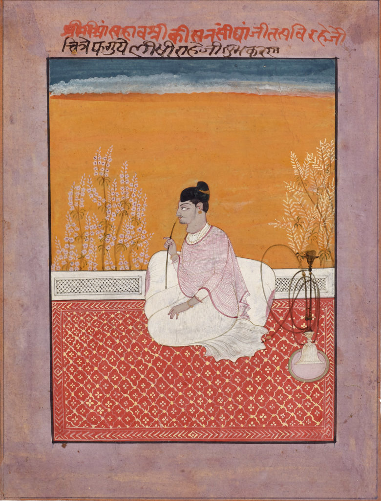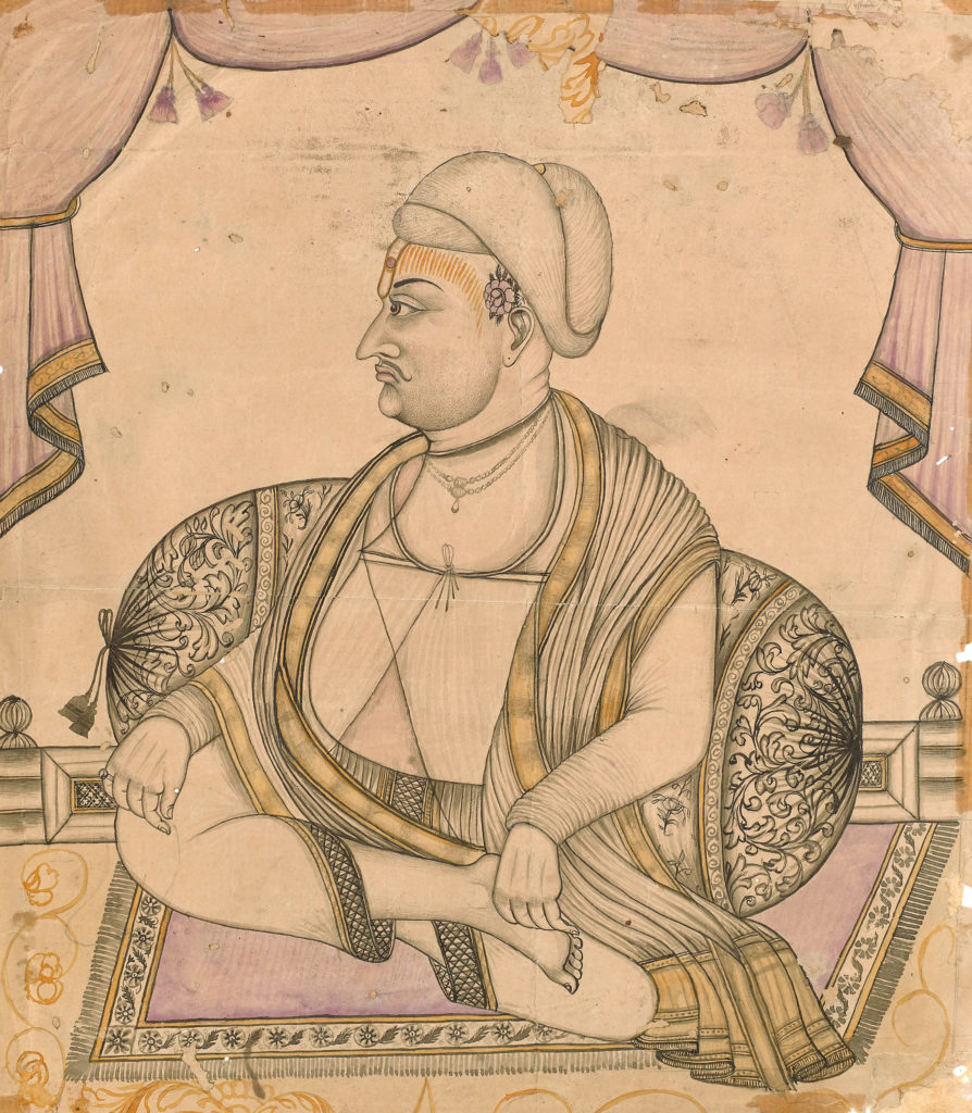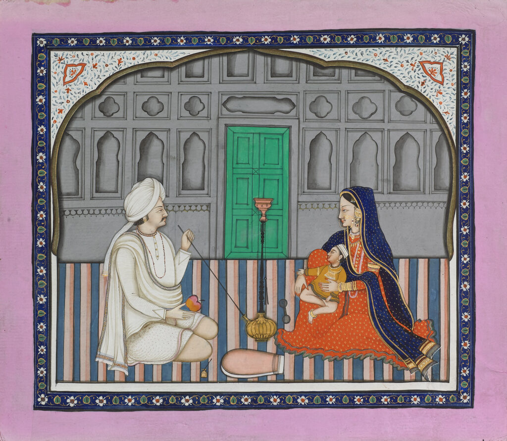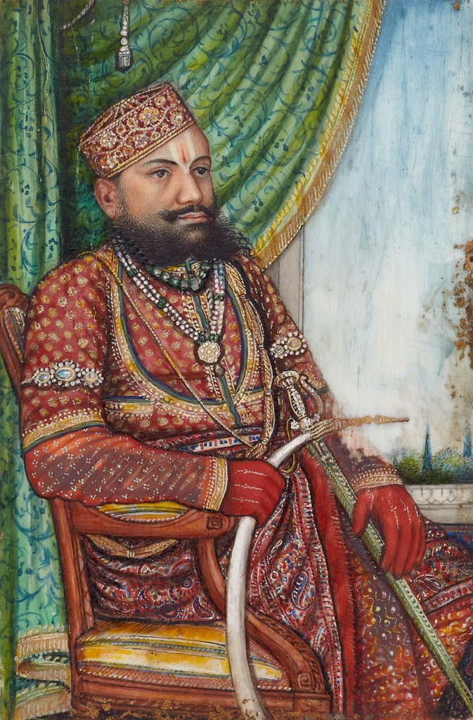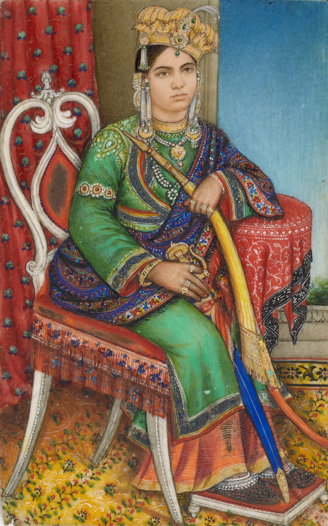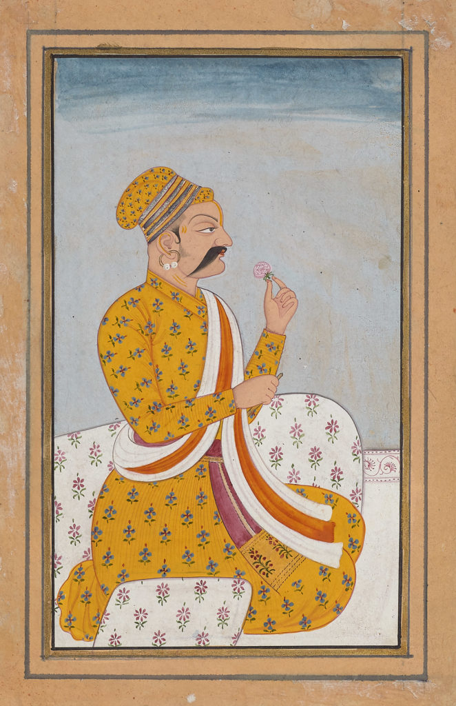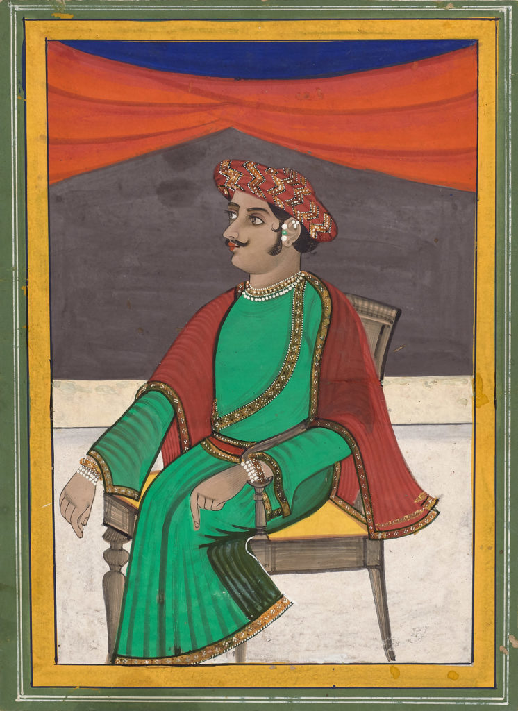 Maharaja Raghuraj Singh of Rewa (r.1854-1880) Lucknow, 1860 Opaque pigments with gold on ivory Image: 11.4 x 7.1 cm In this rare portrait of Raghuraj Singh of Rewa (1854-1880), we see the imposing Raja seated in a European chair, holding a muhnal (hookah pipe) and a sword. He wears a fine red brocade jama with […]