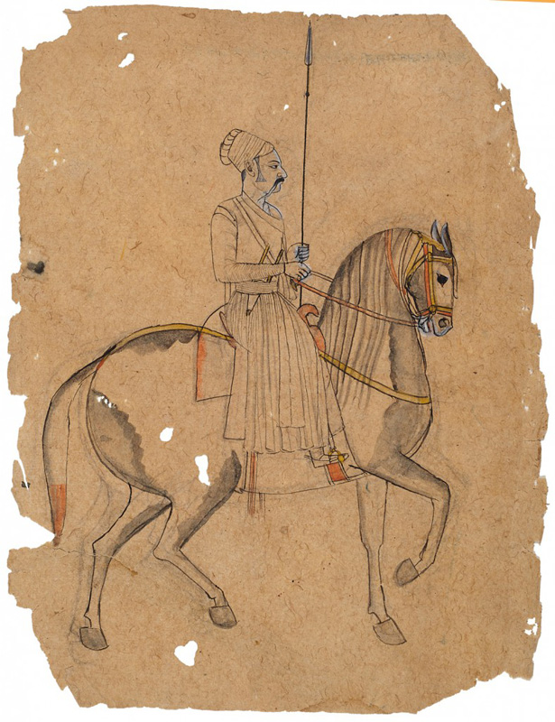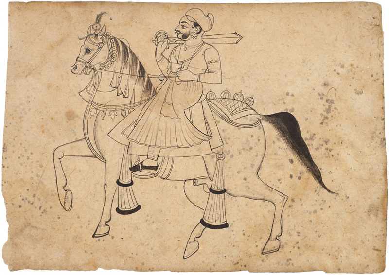 Unidentifiable Mewar noble riding a horse by Mewar court artist circa 1830 CE Khakha or drawing on paper 7 x 10 in. (17.8 x 25.4 cm.)