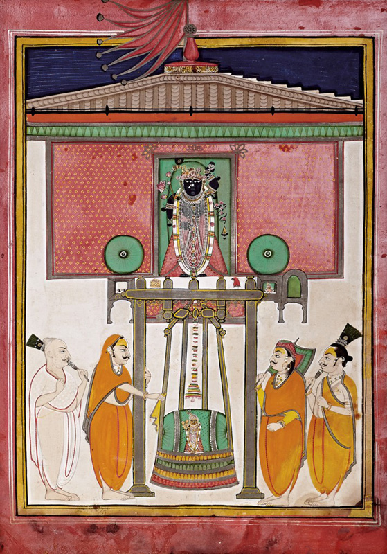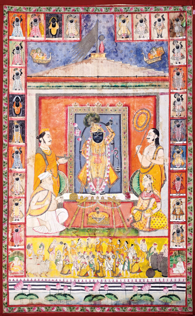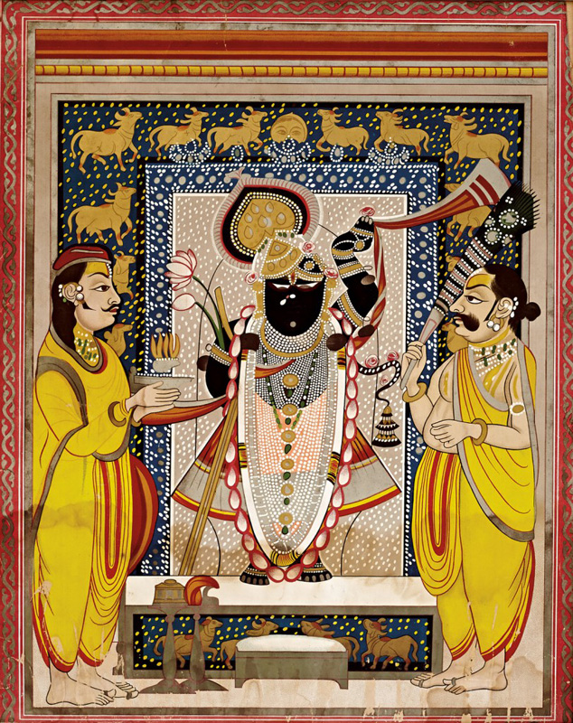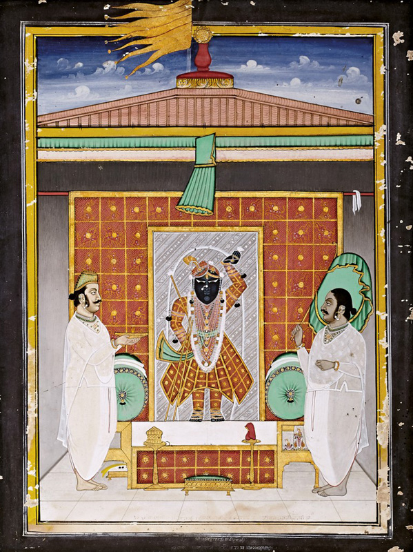 Shrinathji and Madanmohanji on Hindola by Unknown Artist Nathdwara circa 1900 Opaque watercolour, gold and silver on paper 13 x 9.5 in. (33 x 24.1 cm.) In this painting, Shrinathji bears the shringara of a red pichhoda, an A-line long skirt and a kulhe jod on the shrimastaka- head turban with a peacock feather ornament […]