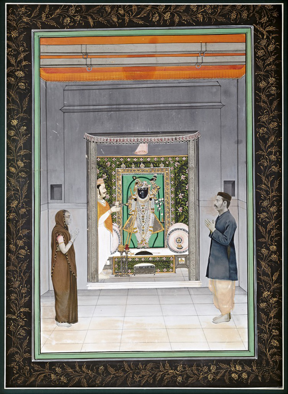 Govardhanlalhji performing Aarti of Shrinathji by Unknown Indian Artist circa 1910 Lithograph Published by Ravi Varma press 30 x 23.50 in (76.2 x 59.7 cm)