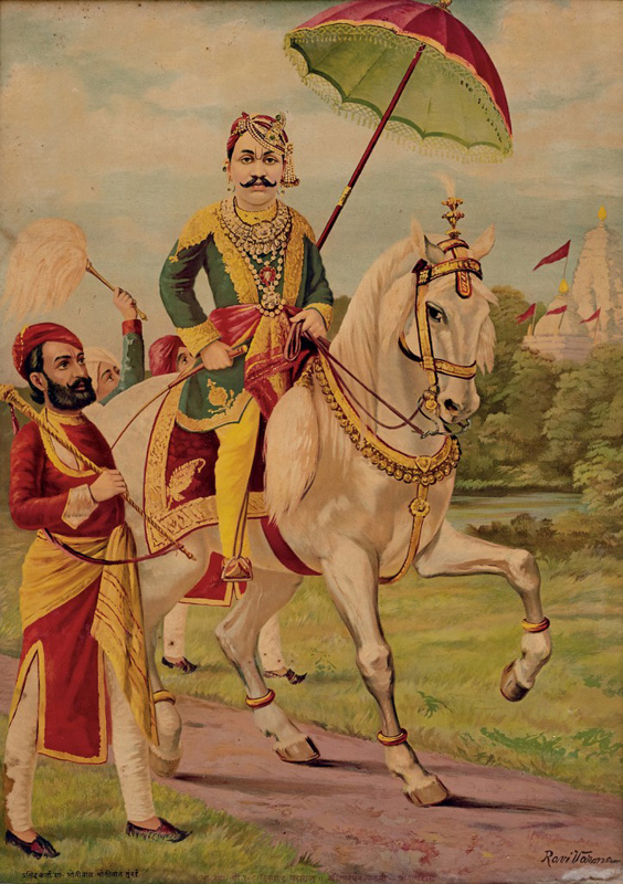 Govardhanlalji passing through temple site while riding on a horse and attendant following by Raja Ravi Varma (1848-1906) circa 1900 Lithograph Published by Ravi Varma press 28 x 20 in (71.1 x 50.8 cm)