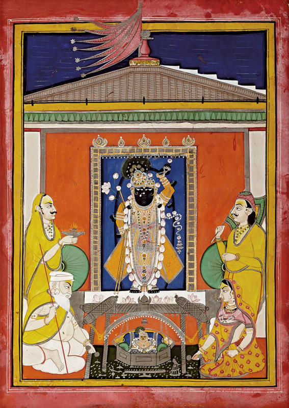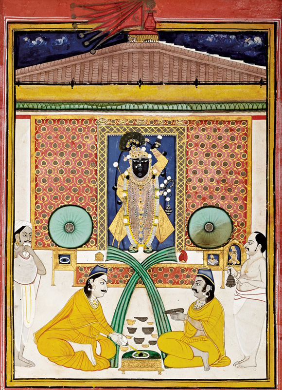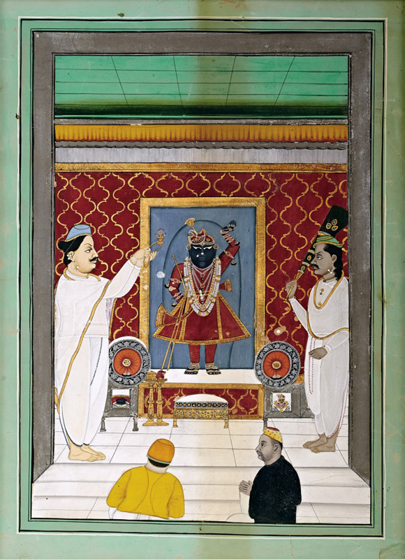 Govardhanlalji performing Aarti of Shrinathji, the priest on right holds a morchhala to protect from an evil eye by Unknown Artist Nathdwara circa 1900 Opaque water colour and gold on paper 13 x 7.5 in. (44.4 x 33 cm.)