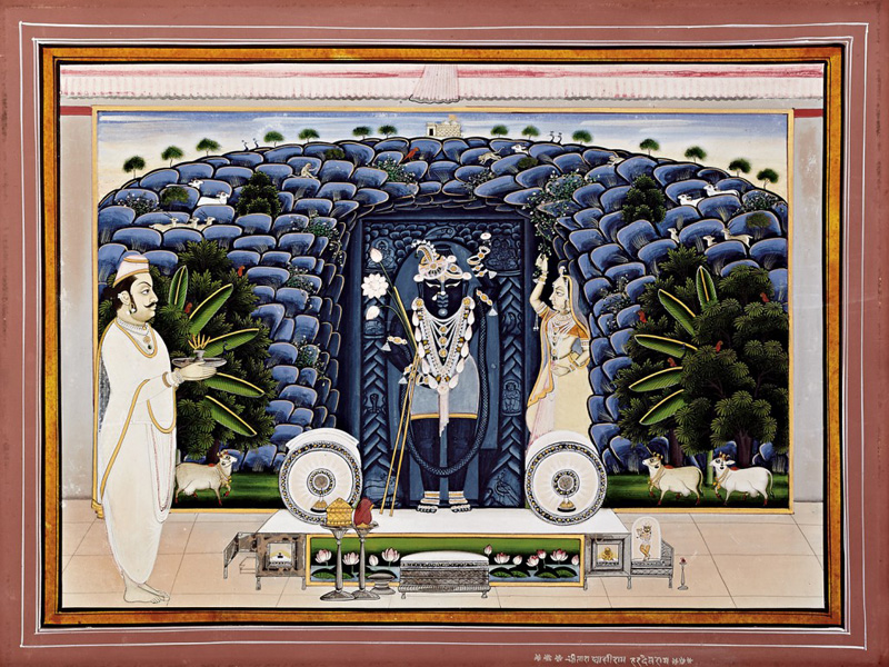 Govardhanlalji performing Aarti on summer day, pichwai dipicts mount Govardhan and Radha on the left of Shrinathji by Ghasiram Hardev Sharma (1868-1930) Nathdwara circa 1900 Opaque water colour and gold on paper 10.25 x 13.5 in. (26 X34.3 cm.)