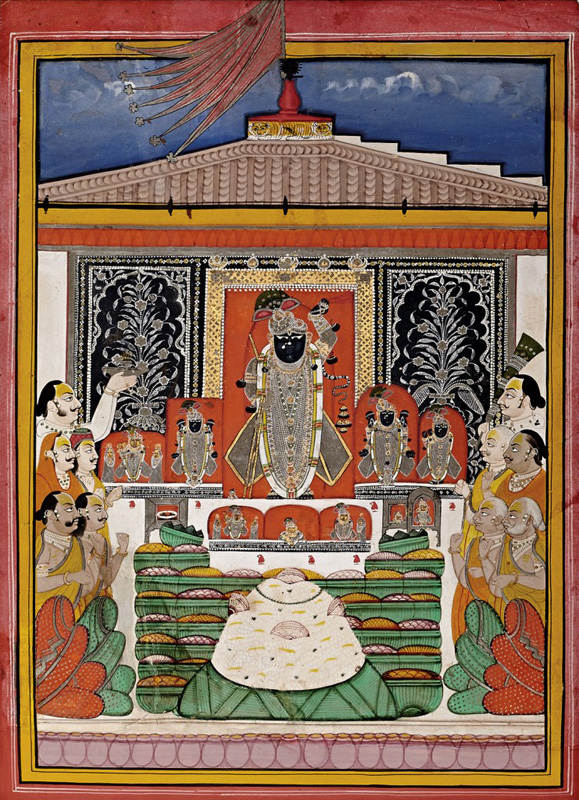 Celebration of Sapta Swarupa Annakutotsava with many Gossainjis by Unknown Artist Nathdwara circa 1900 Opaque watercolour, gold and silver on paper 13 x 9.5 in. (33 x 24.1 cm.) The festival of Annakuta commemorates the lifting of Mount Govardhan by Lord Krishna to protect the villagers of Vraja from the wrath of Lord Indra and […]