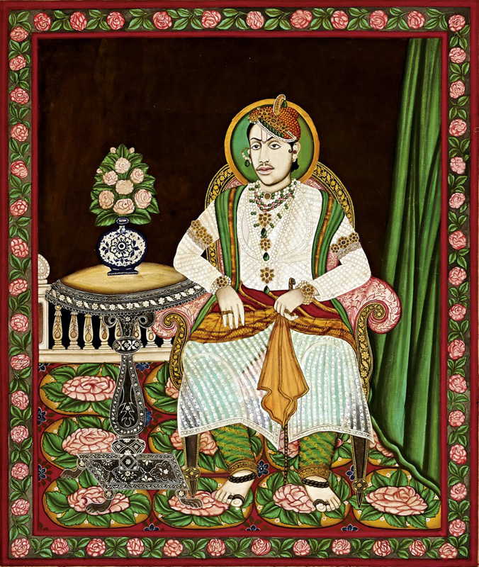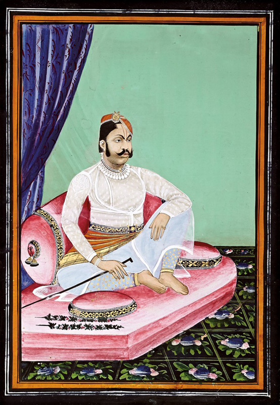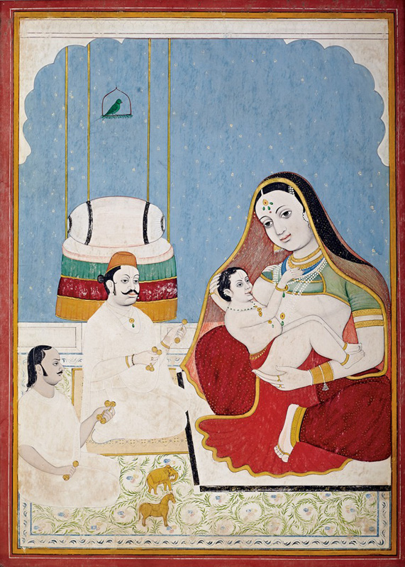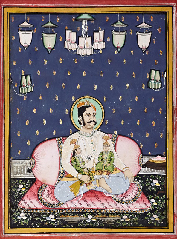 Sitting on a pink mattress in traditional style by Unknown Artist Nathdwara circa 1890 Opaque watercolour and gold on paper 11.75 x 8.5 in. (29.8 x 21.6 cm.)