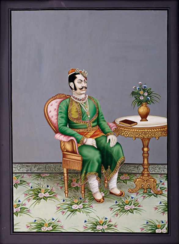 Govardhanlalji sitting on a chair in European manner by Unknown Artist Nathdwara circa 1890 Opaque watercolour and gold on paper 18 x 13 in. (45.7 x 33 cm.)