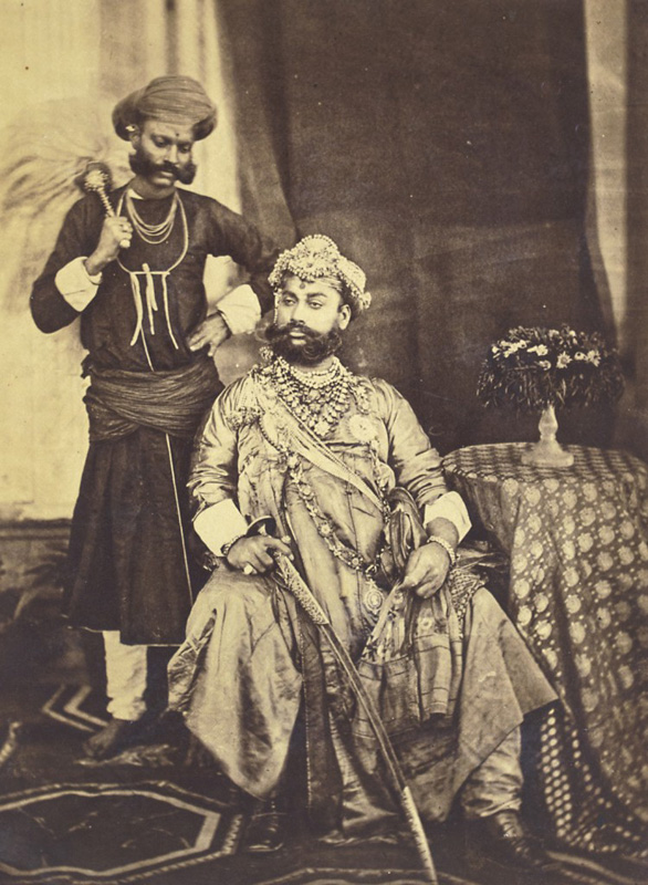 Sir Tukoji Rao Holkar II (1833 – 1877) The Maharaja of Indore who ruled between 1885 to 1886 and belonged to the Holkar Dynasty of the Marathas. This photograph with attendant was taken during Imperial Assemblage of 1877, popularly known as the Delhi durbar. Gelatin silver print, mounted 9.5 x 7 in. (24 x 17.8 cm.) Photographer: Bourne […]