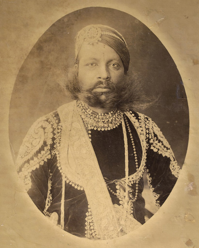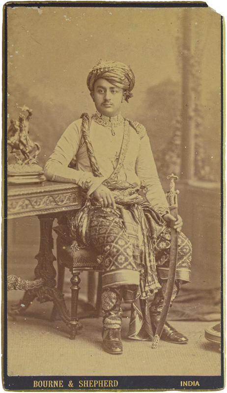 Raja Gobind Singhji (1835 – 1905) He was the 10th Raja of Banera, descended from the brother of Raja Jay Singh of Mewar. He married three times but had only two children from his third wife, Rani Kachhwahiji. Albumen print with name on mount 10.75 x 8.5 in. (27.3 x 21.6 cm.) Unknown Photographer, c. 1885