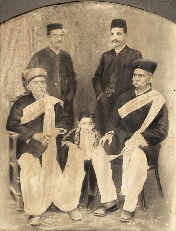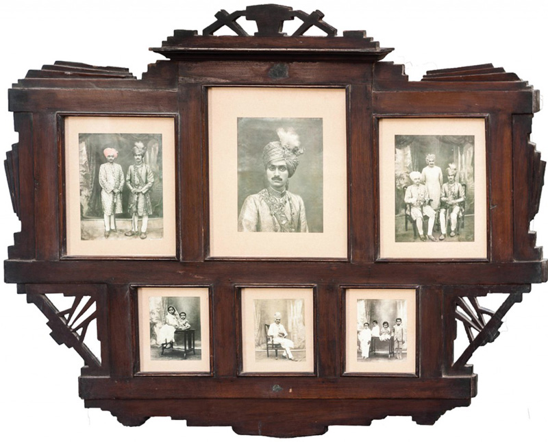 Shri Vanche Jivawala of Manpur Here different portraits have been placed strategically on a decorative teak wood frame. The portraits are of the ruler’s son and his brothers composed like a family tree using different studio photographs. Gelatin silver print 30 x 36 in. (76.2 x 91.4 cm.) frame Unknown Photographer, c. 1920