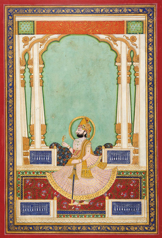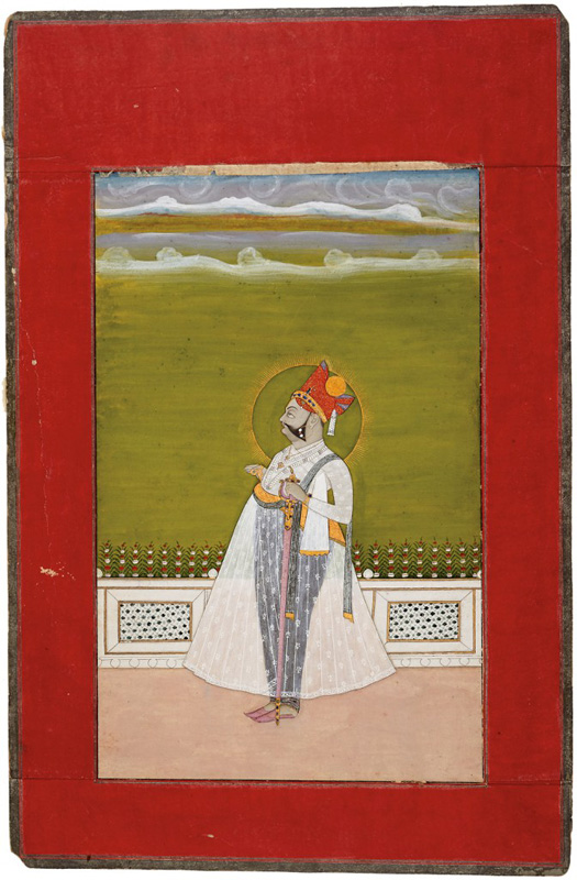Maharaja Man Singh (1783, r.1803-1843) of Jodhpur by Jodhpur court artist circa 1840 CE Gouache on paper 14.5 x 10 in. (36.8 x 25.4 cm.) A neat and refined early nineteenth century Jodhpur style portrait painted during the reign of Maharaja Man Singh shows him in his royal self, standing inside a lavishly decorated marble pavilion lined with […]